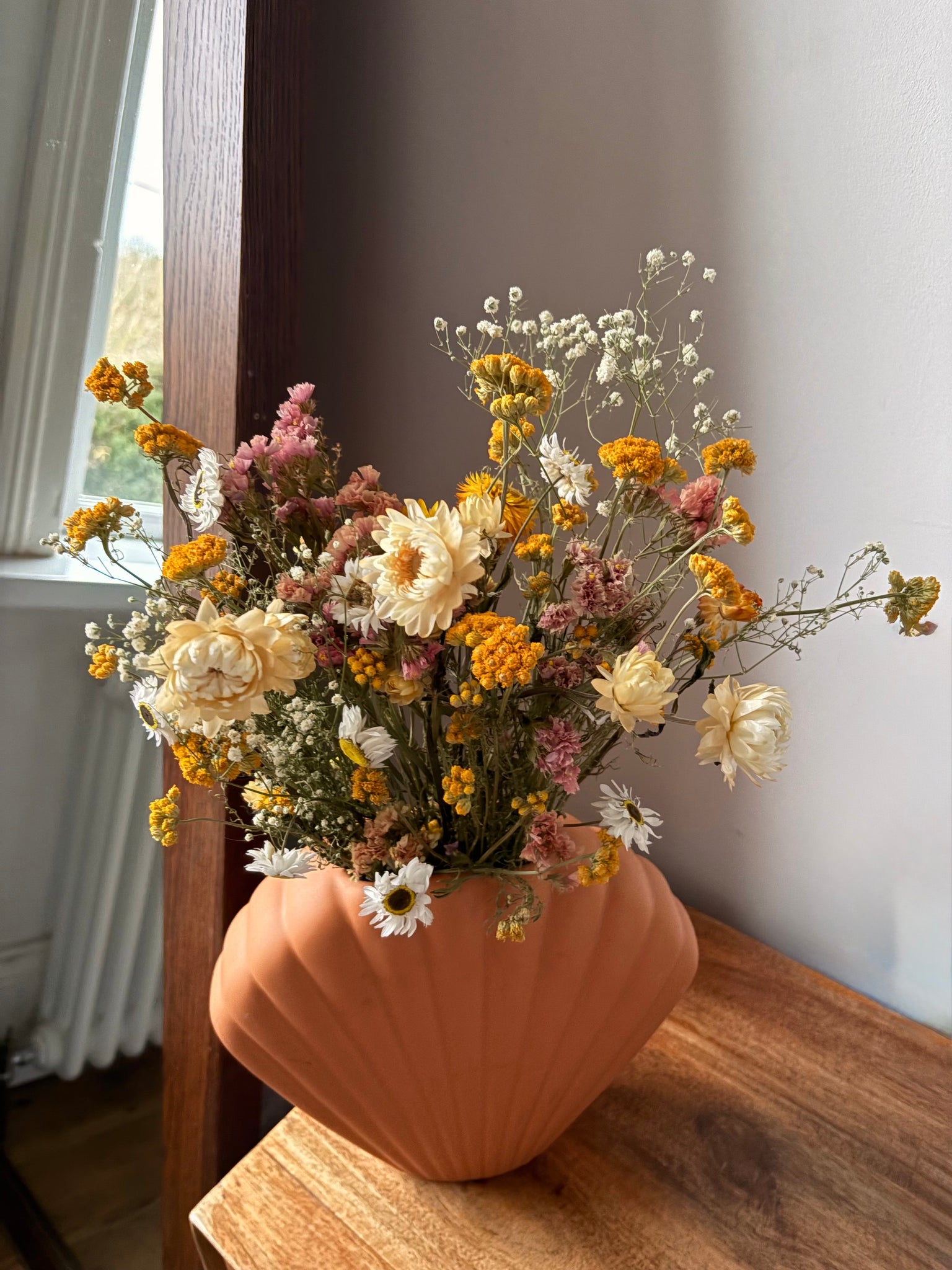 A handcrafted dried flower arrangement showcasing a joyful blend of warm peach and sunny yellow hues.This bouquet is designed to bring instant colour and cheer to your home, without the fuss of fresh flowers.